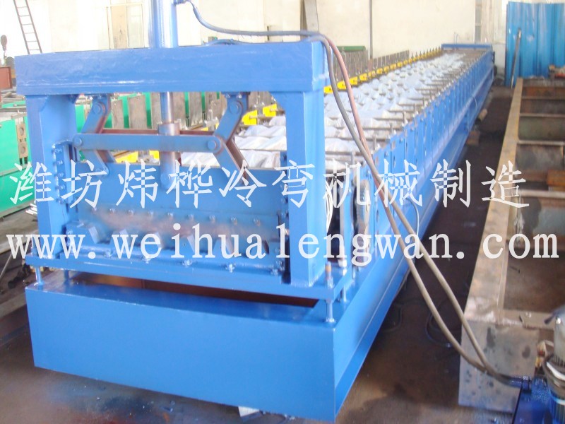 壓型機由供料裝置,傳動裝置,成型輥道及主機,成型后切斷裝置,液壓系統,電控系統,成品托料裝置等組成。