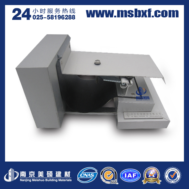 由鋁合金基座、鋁合金中心蓋板(不銹鋼板、黃銅板)不銹鋼滑桿組成。變形縫鋁合金基座固定在屋頂縫邊,基座上嵌有橡膠止水膠條,在金屬結(jié)構(gòu)和房屋結(jié)構(gòu)之間墊襯整長延壓的三元乙丙止水帶。在蓋板與固定于變形縫兩側(cè)的基座之間采用不銹鋼滑桿連接,滑桿的設(shè)置適應(yīng)屋頂多方變位,具有優(yōu)良的防水性能和抗震性能,確保由于主體結(jié)構(gòu)變形引起基座變位時(shí),金屬蓋板仍保持在縫的中心位置。具有與裝修層結(jié)合平整的特點(diǎn)。適用于50-500mm縫寬。