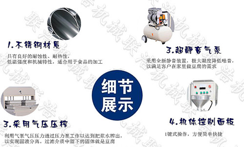 該設備是現代化技術與傳統工藝的結晶,整體由不銹鋼制造,完全符合衛生標準,經久耐用。即時彩色果蔬豆腐(豆漿)一體機實現了生產過程自動化,具有高效、省時、耗能低、占地小、無噪聲、無污染等優點。而且采用先進磨漿技術,瞬間加熱工藝,保證了蛋白質不受破壞,從而使生產出來的豆制品營養更豐富,味道更鮮美。