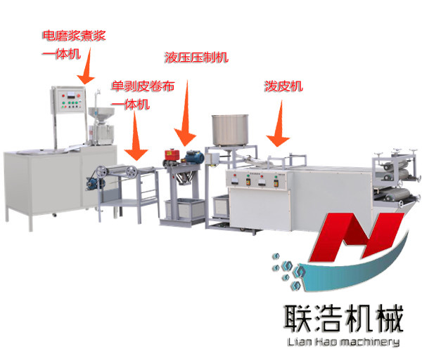 5、 工藝流程:黃豆浸泡-磨漿-煮漿-成型-壓皮-剝布-成型。