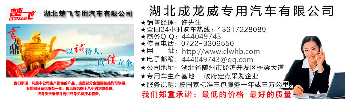 湖北成龍威專用汽車有限公司從2002年開(kāi)創(chuàng)至今,已在專用汽車領(lǐng)域行走了12年。十二年里,湖北成龍威專用汽車有限公司堅(jiān)持:以人為本,以信立企,技術(shù)革新,緊抓產(chǎn)品質(zhì)量。堅(jiān)持給客戶:最優(yōu)惠的價(jià)格,最好的質(zhì)量,最完善的售后服務(wù)。在吸污車吸污車及專用汽車領(lǐng)域創(chuàng)造了一個(gè)又一個(gè)奇跡。其注冊(cè)品牌:“楚飛牌”暢銷全國(guó)各地,出口世界