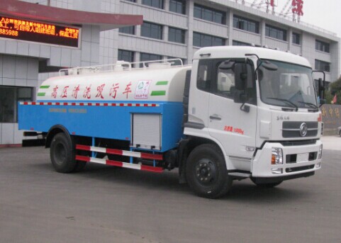 駕駛室前臉擾流罩為選裝件.罐體有效容積:8.61立方米,運輸介質: 水,密度:1.0噸/立方米,當軸距為4700(mm)時,罐體外形尺寸(長×長軸×短軸)(mm)5000×2150×1350(罐體前部1200長為半剖面,下部用于安裝高壓泵).當軸距為4500(mm)時,罐體外形尺寸(長×長軸×短軸)(mm)4800×2180×1400(罐體前部1200長為半剖面,下部用于安裝高壓泵).側防護材料為Q235,聯接方式為連接支架固焊在付車架大梁上.后防護材料為Q235,連接方式:用結構連接件固焊在主車后端,后部防護裝置斷面尺寸(寬×高)60×300(mm),后部防護離地高度:450(mm).采用4700mm,4500mm軸距底盤.裝有具有衛星定位的行車記錄儀.ABS型號:3631010-C2000,生產廠家:東風電子科技股份有限公司制動系統公司.