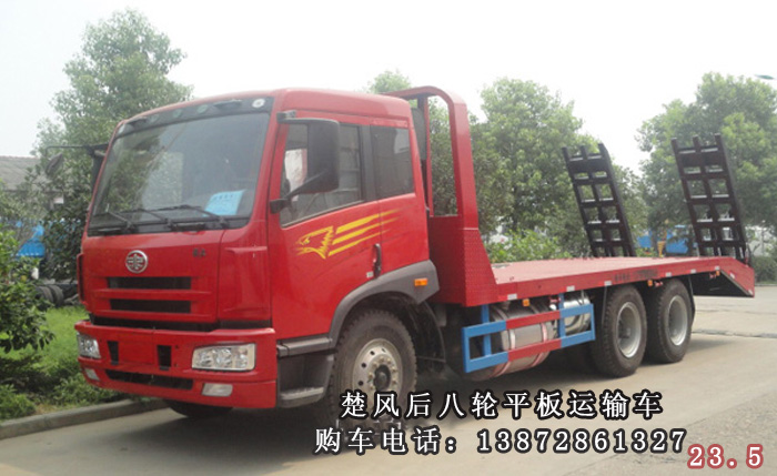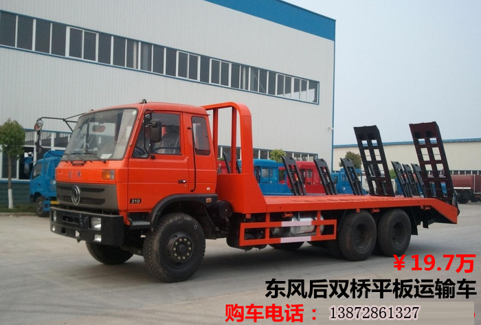 配備140馬力發動機、雙層大梁結構、8.25-20的輪胎、發國三合格證、實際可拉16噸、外型尺寸(mm): 8400×2500×2800 軸距1900+4250,采用加強型雙彈簧爬梯。該車專為中小型挖掘機設計,是120型號以下挖掘機最好的運輸車,東其改裝部分采用板材厚度:5mm花紋板,爬梯:120mm套100mm槽鋼,橫梁:100mm國標方鋼,平板離地面高度850mm—900mm。貨臺長6米,寬2.5米,是運輸8-12噸小型挖掘機,推土機,收割機的最理想車型.貨臺離地面只有0.85米.適合各種路況的運輸車。