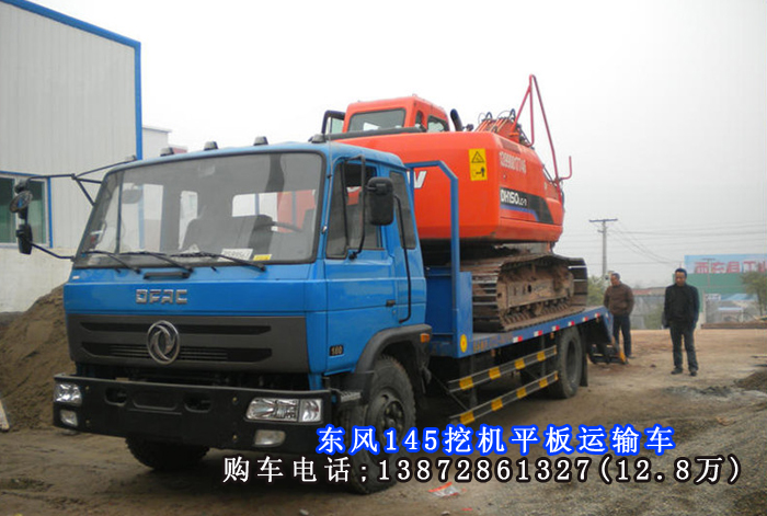 東風145、153挖機拖板車(上戶噸位9.8噸-10噸)車子主要配置有:采用東風EQ1167原裝底盤,雙層大梁,玉柴160馬力,9.00-20輪胎,整車長度為9米,板長為6.6米,可以運輸10噸12噸15噸18噸的挖機。