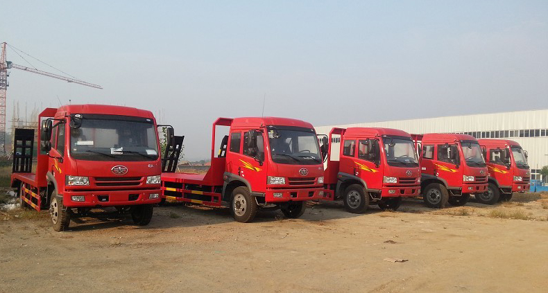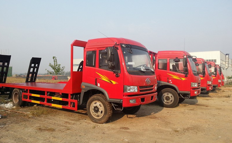 熱銷四:解放小型8-15噸工程機械平板運輸車(上戶噸位9噸) 車子主要配置有:采用CA1123底盤,雙層大梁,錫柴140馬力帶增壓方向助力,8.25-20輪胎,板長6.6-6.8米,可以8-15噸挖機。