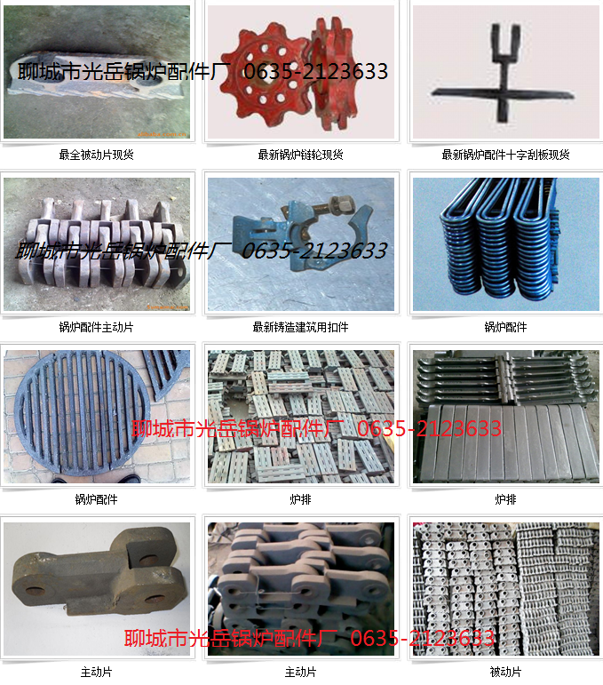 聊城市光岳鍋爐配件廠位于國內外著名的“江北水城”----聊城市工業開發區,北臨濟館高速,交通便利,通訊及時。電 話 0635-2123633 13563589538 公司始終堅持“質量第一、用戶至上”的宗旨,樹立一流形象,制造時代一流產品,創造一流品質。本廠主要生產耐高溫,耐磨,耐燒,壽命長,瑪鋼,鑄鋼 ,球鐵,灰鐵鍋爐配件,爐排,爐排片系列。聊城光岳鍋爐配件本廠鍋爐配件主要產品有;瑪鋼(KT370-12);主動爐排/被動爐排/左右主動爐排/活芯爐排(抽芯爐排)鏈輪等,鑄鋼;鑄鋼主動爐排/鑄鋼鏈輪(6齒--18齒)等。廠主要生產瑪鋼、灰口、球墨、鑄鋼等材質的鍋爐配件、主動片、被動片、大(小齒)六齒鏈輪、九齒鏈輪、十一齒鏈輪、十二齒鏈輪、十三齒鏈輪、十五齒鏈輪、十六齒鏈輪、十八齒鏈輪、魚鱗片、爐排長銷、短銷、鍋爐管、手孔、四爪爐排、活心爐排、人孔、頭孔、十字刮板、各式爐門、老鷹鐵、滾柱、夾板、風帽、軸承座、煤擋板、大小鏈節、調節螺母、等鍋爐配件! 我廠工藝先進,信守合同,質量第一廠全體員工歡迎各地新老客戶前來洽談業務,長期合作,共同發展聊城市光岳鍋爐配件廠【總經理張經理】電話13563589538 0635-2123633 網址:www.gyglpj.com