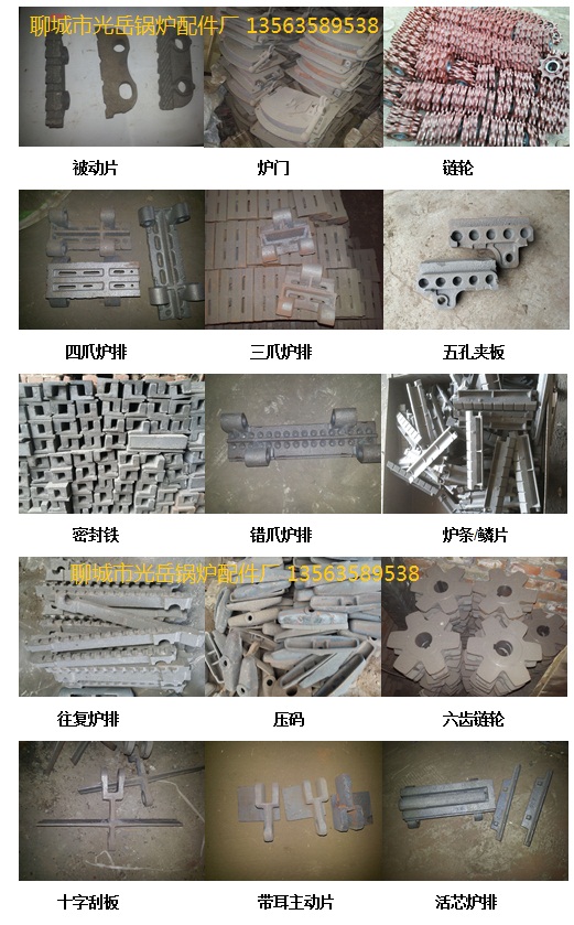 聊城市光岳鍋爐配件廠位于國內外著名的“江北水城”----聊城市工業開發區,北臨濟館高速,交通便利,通訊及時。電 話 0635-2123633 13563589538 公司始終堅持“質量第一、用戶至上”的宗旨,樹立一流形象,制造時代一流產品,創造一流品質。本廠主要生產耐高溫,耐磨,耐燒,壽命長,瑪鋼,鑄鋼 ,球鐵,灰鐵鍋爐配件,爐排,爐排片系列。聊城光岳鍋爐配件本廠鍋爐配件主要產品有;瑪鋼(KT370-12);主動爐排/被動爐排/左右主動爐排/活芯爐排(抽芯爐排)鏈輪等,鑄鋼;鑄鋼主動爐排/鑄鋼鏈輪(6齒--18齒)等。廠主要生產瑪鋼、灰口、球墨、鑄鋼等材質的鍋爐配件、主動片、被動片、大(小齒)六齒鏈輪、九齒鏈輪、十一齒鏈輪、十二齒鏈輪、十三齒鏈輪、十五齒鏈輪、十六齒鏈輪、十八齒鏈輪、魚鱗片、爐排長銷、短銷、鍋爐管、手孔、四爪爐排、活心爐排、人孔、頭孔、十字刮板、各式爐門、老鷹鐵、滾柱、夾板、風帽、軸承座、煤擋板、大小鏈節、調節螺母、等鍋爐配件! 我廠工藝先進,信守合同,質量第一廠全體員工歡迎各地新老客戶前來洽談業務,長期合作,共同發展聊城市光岳鍋爐配件廠【總經理張經理】電話13563589538 0635-2123633 網址:www.gyglpj.com