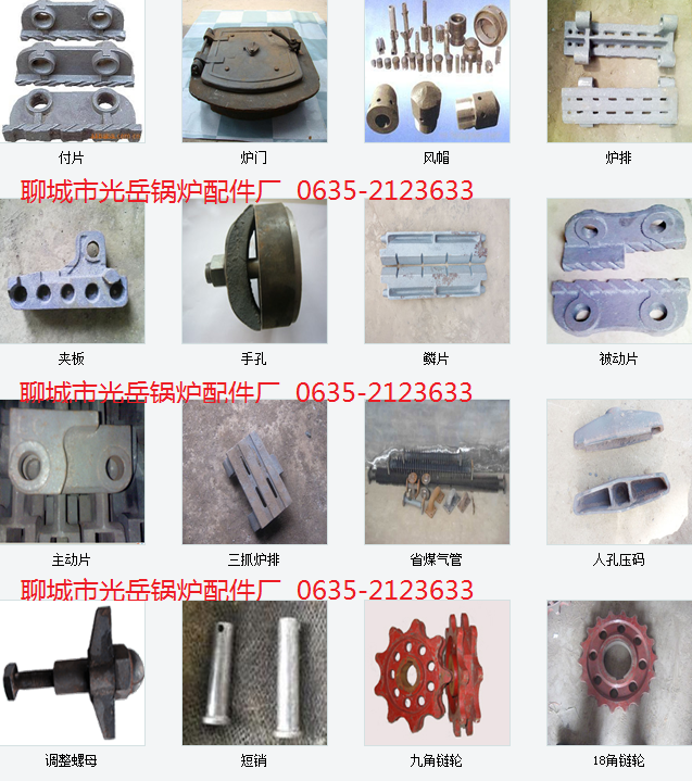 聊城市光岳鍋爐配件廠位于國內外著名的“江北水城”----聊城市工業開發區,北臨濟館高速,交通便利,通訊及時。電 話 0635-2123633 13563589538 公司始終堅持“質量第一、用戶至上”的宗旨,樹立一流形象,制造時代一流產品,創造一流品質。本廠主要生產耐高溫,耐磨,耐燒,壽命長,瑪鋼,鑄鋼 ,球鐵,灰鐵鍋爐配件,爐排,爐排片系列。聊城光岳鍋爐配件本廠鍋爐配件主要產品有;瑪鋼(KT370-12);主動爐排/被動爐排/左右主動爐排/活芯爐排(抽芯爐排)鏈輪等,鑄鋼;鑄鋼主動爐排/鑄鋼鏈輪(6齒--18齒)等。廠主要生產瑪鋼、灰口、球墨、鑄鋼等材質的鍋爐配件、主動片、被動片、大(小齒)六齒鏈輪、九齒鏈輪、十一齒鏈輪、十二齒鏈輪、十三齒鏈輪、十五齒鏈輪、十六齒鏈輪、十八齒鏈輪、魚鱗片、爐排長銷、短銷、鍋爐管、手孔、四爪爐排、活心爐排、人孔、頭孔、十字刮板、各式爐門、老鷹鐵、滾柱、夾板、風帽、軸承座、煤擋板、大小鏈節、調節螺母、等鍋爐配件! 我廠工藝先進,信守合同,質量第一廠全體員工歡迎各地新老客戶前來洽談業務,長期合作,共同發展聊城市光岳鍋爐配件廠【總經理張經理】電話13563589538 0635-2123633 網址:www.gyglpj.com