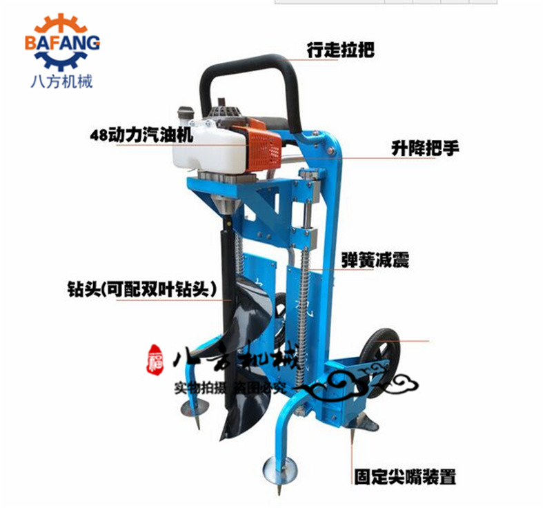 63cc汽油機: 風冷單缸二沖程,發動機排量:63CC, 啟動方式:手拉反沖起動,燃油比:汽油與二沖程機油25:1, 適于挖300mm以內的坑