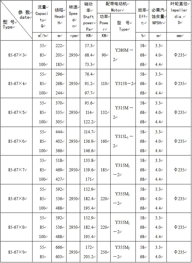 長(zhǎng)沙鍋爐泵DG85-67*3產(chǎn)品參數(shù)表