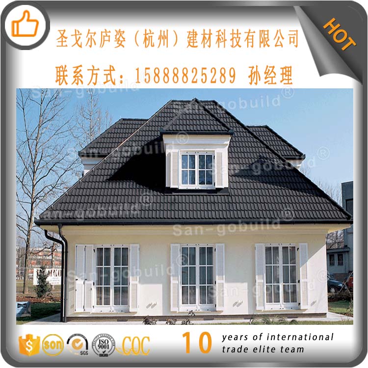 還有就是我們用的彩砂,圣戈邦彩石金屬瓦選用的是由玄武巖加工而成的燒結砂,玄武巖是修理公路、鐵路、機場跑道所用石料中最優質的材料,具有抗壓性強、壓碎值低、抗腐蝕性強、瀝青粘附性玄武石,玄武石具有耐磨、吃水量少、導電性能差、抗壓性強、壓碎值低、抗腐蝕性強、瀝青粘附性等優點,并被國際認可。所以這種彩砂價格比較貴,但貴有貴的好處,它不會掉色,即使用利器敲碎,細小的砂礫顏色還是最初的顏色。