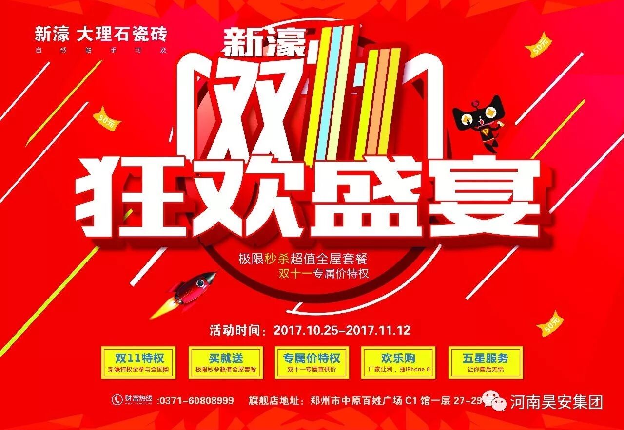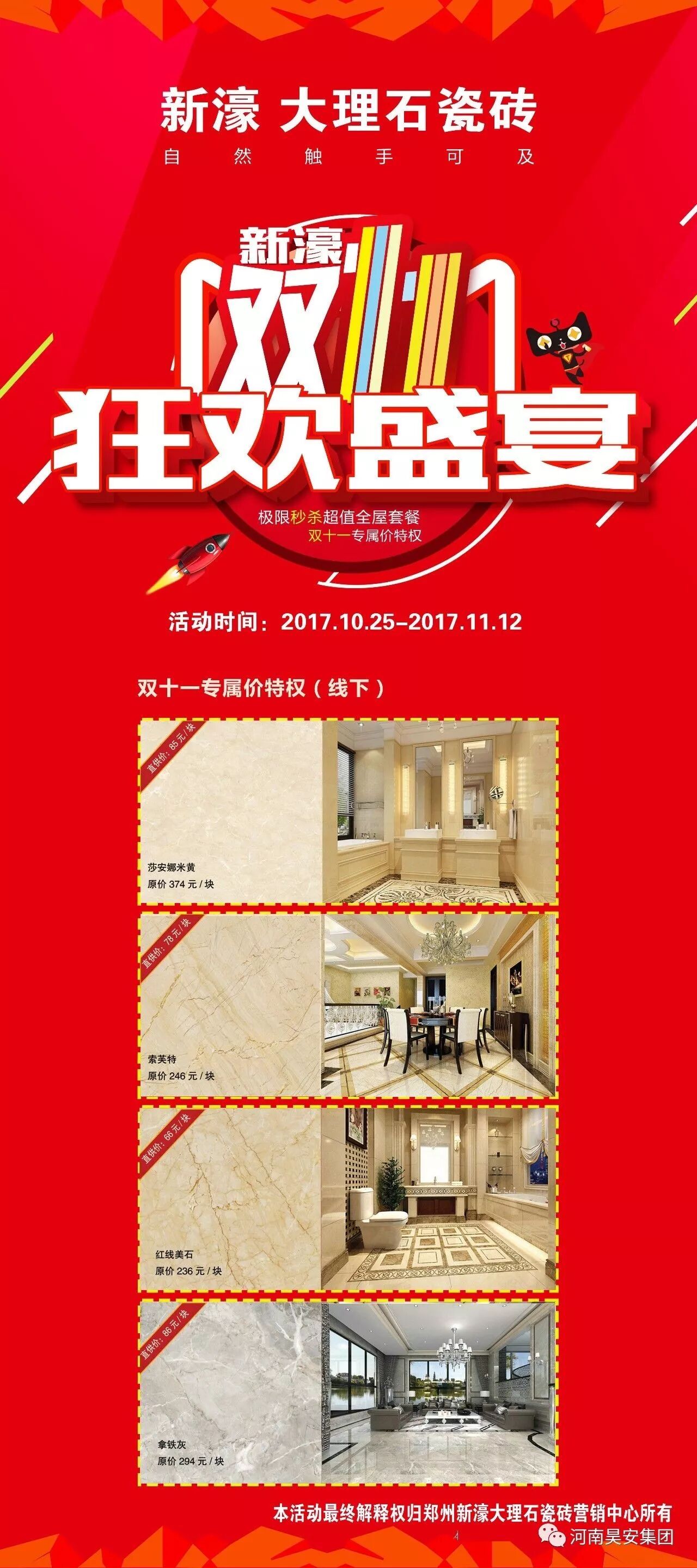 在新濠天貓旗艦店購買價值100元《新濠特權金》,在全國各地新濠大理石瓷磚旗艦店參加雙十一優惠活動!
