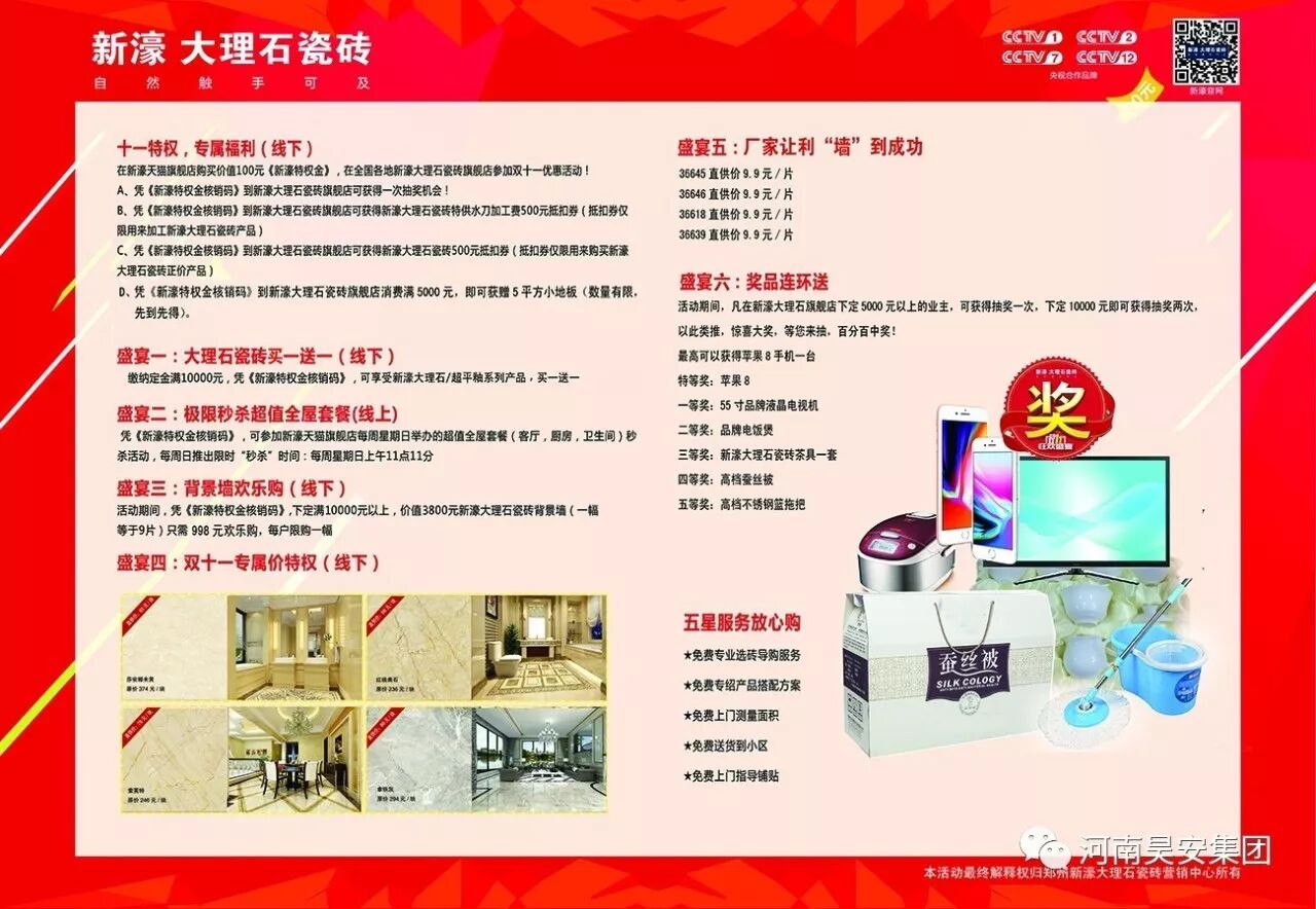 活動期間,凡在新濠大理石旗艦店下定5000元以上的業主,可獲得1次抽獎機會,下定10000元以上的業主可獲得2次抽獎機會,以此類推,驚喜大獎,等你來抽,百分百中獎!