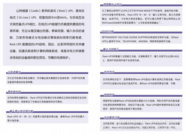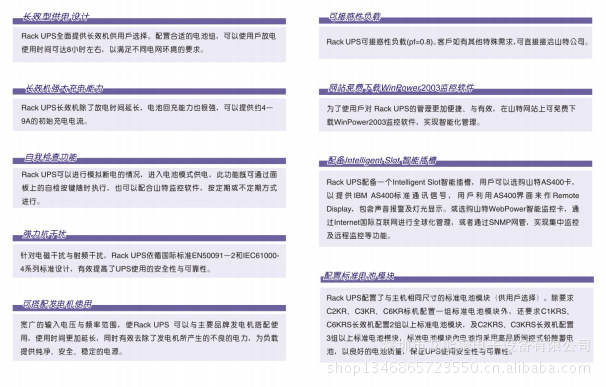 Rack UPS全部供給長效機供用戶挑選。裝備適宜的電池組,能夠運用戶放電運用時刻可達8小時擺布,以滿意不一樣電網環境的請求。