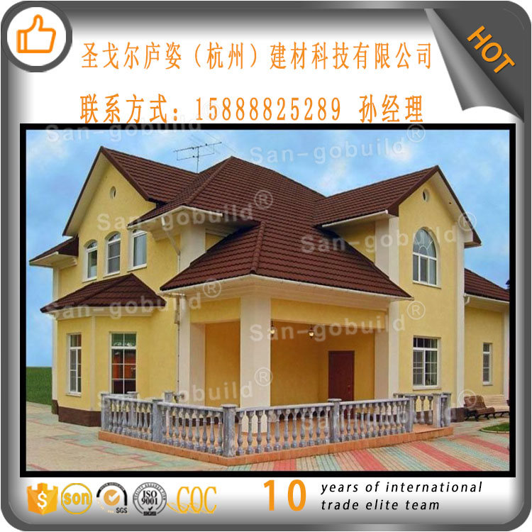 3、在鍍鋁的彩石的板合鋼的材料混合而成,具有防止漏水和防止色彩掉色的現(xiàn)象. 彩石金屬瓦,裝飾現(xiàn)代風(fēng)格的時(shí)尚感,體現(xiàn)了時(shí)尚建筑的效果美和建筑風(fēng)格的獨(dú)特性化,從而提高了建筑風(fēng)格的現(xiàn)代簡單美,使用于各類房頂建筑的裝飾,房屋與主人的雙色效果,用于長期在室外暴露的耐久性的材料,能長期承受紫外線照射的使用性能。