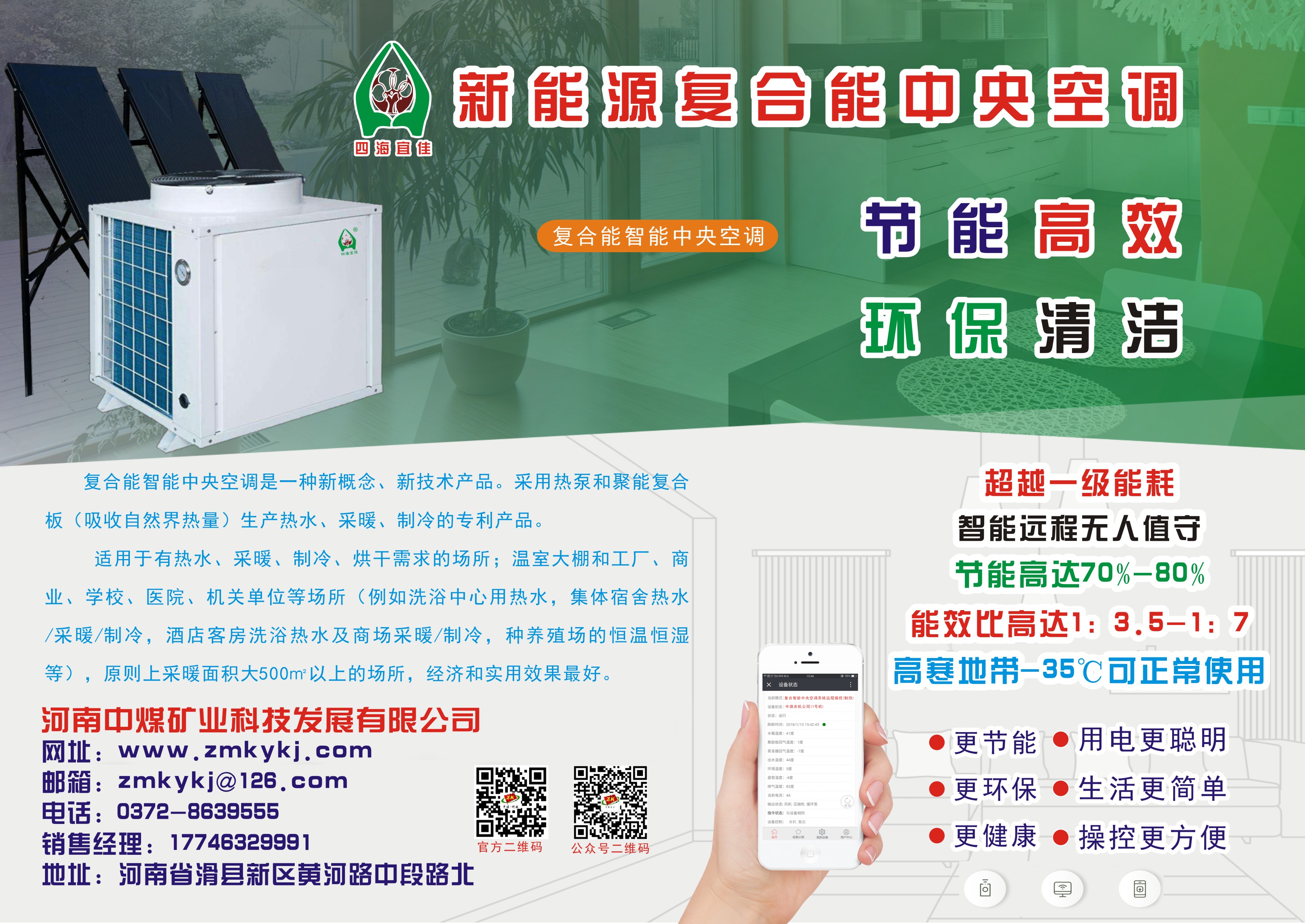 復合能智能中央空調(diào)是一種新概念、新技術(shù)產(chǎn)品。采用熱泵和聚能復合板(吸收自然界熱量)生產(chǎn)熱水、采暖、制冷的專利產(chǎn)品。