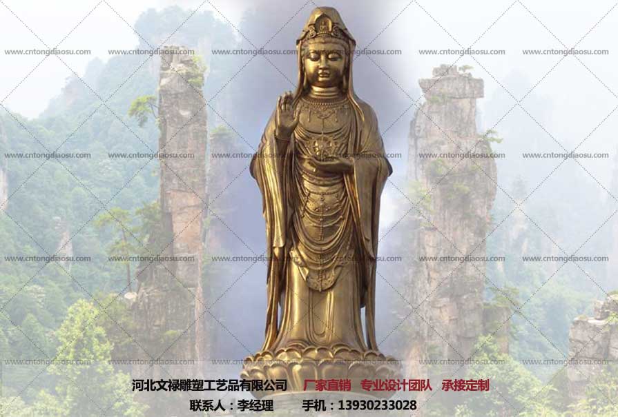 觀音菩薩又作觀世音菩薩、觀自在菩薩、光世音菩薩等,他相貌端莊慈祥,經(jīng)常手持凈瓶楊柳,具有無量的智慧和神通,大慈大悲,普救人間疾苦。當(dāng)人們遇到災(zāi)難時,只要念其名號,便前往救度,所以稱觀世音。銅觀音的種類有很多,像是三面觀音、千手觀音、凈瓶觀音、蓮座觀音、送子觀音等多種觀音樣式。