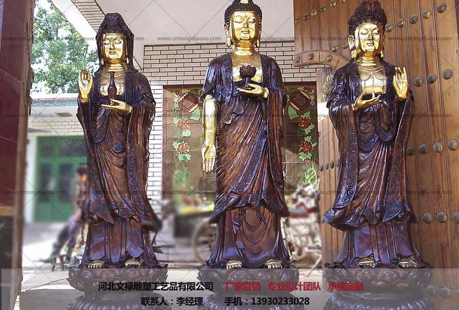 西方三圣是一種非常別致的造型,而且在民間也有不少的傳奇故事。而此作為雕刻的對象成其為一款上乘之作也是非常不錯的大家都知道佛教跟伊斯蘭教和基督教并稱三大宗教,佛教作為世界主要宗教之一,以悠久的歷史和廣泛的文化和廣泛的流傳范圍流傳至今。佛教廣泛的流傳于亞洲的許多國家,后來隨著青銅的出現銅雕界的能手們為了尊崇和繼續推廣佛教文化把一尊尊佛像轉化成銅雕佛像。西方三圣雕塑也是由此而來的西方三圣顧名思義就是三位佛像組成的這三位佛像分別是阿彌陀佛、觀世音菩薩和大勢至菩薩他們合稱西方三圣。阿彌陀佛是表無量光明,無量的壽命,無量的功德。觀音菩薩是表大慈悲,宇宙的大慈悲。大勢至菩薩是代表喜舍。這三位神像的組合無疑是一個美好的象征這也充分體現出人們對美好生活的向往。也象征著人們祈求消災延壽的心思。