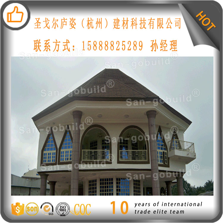 彩石金屬瓦屬于現今社會新型的環保屋面瓦,其可以百分百回收利用,亦可以在原有屋面直接施工,金屬瓦色彩多樣、瓦型多樣,適合各種屋面,最主要的就是金屬瓦選用原材料無毒無害,我們現在施行可持續發展觀、環境友好型社會,這要求人類與自然和諧相處,首要就是愛護環境,圣戈邦金屬瓦順應時代要求,積極生產環保型建材。