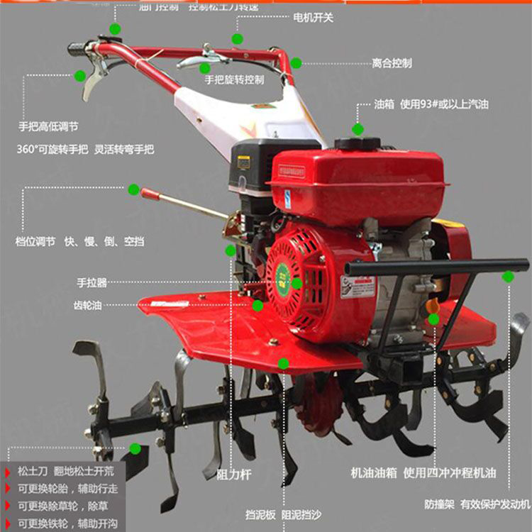 本機器包括機架、可調高低扶手,機架上設有(風冷或水冷)柴油機或汽油機、機架和扶手上設置有變速箱,變速箱的輸出軸上設置有能夠沿軸移動的驅動輪或鏈軌.傳動方式主要有:全齒輪傳動、皮帶傳動、鏈條傳動三種傳動方式.該機具有重量輕,油耗低、相對功率大,結構緊湊、機動性強、操縱輕便靈活的特點。可爬坡、越埂、階梯性強。廣泛適用于平原、山區、丘陵的旱地、水田、果園、菜地、煙地的深旋耕、淺旋耕、犁耕。配上相應機具可進行旱地旋耕、水田旋耕、抽水、開溝、噴淋、噴藥除草碎土等作業,還可牽引拖車進行短途運輸,是大中型農機無法媲美的多功能田園管理機,工作穩定可靠、使用壽命長、維修方便等特點。是進入農民家庭最理想的田園管理機。