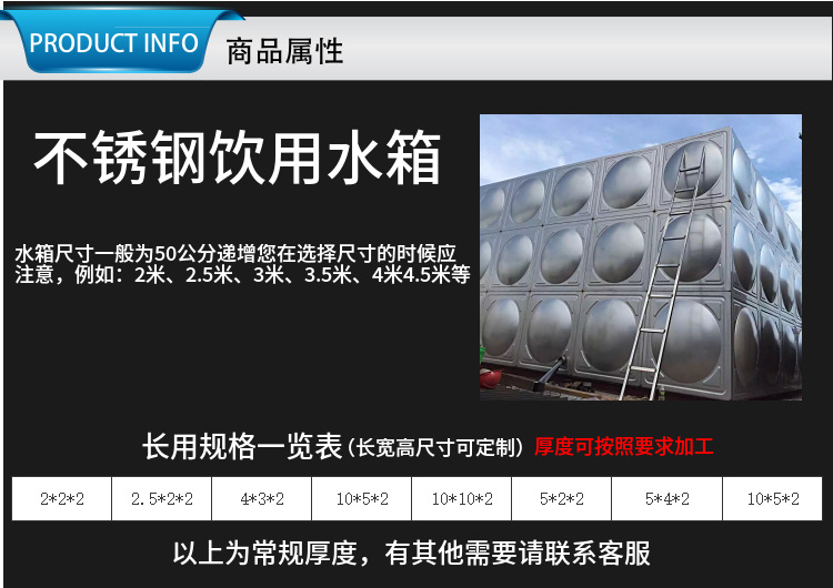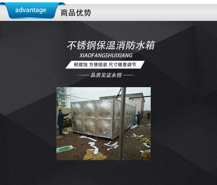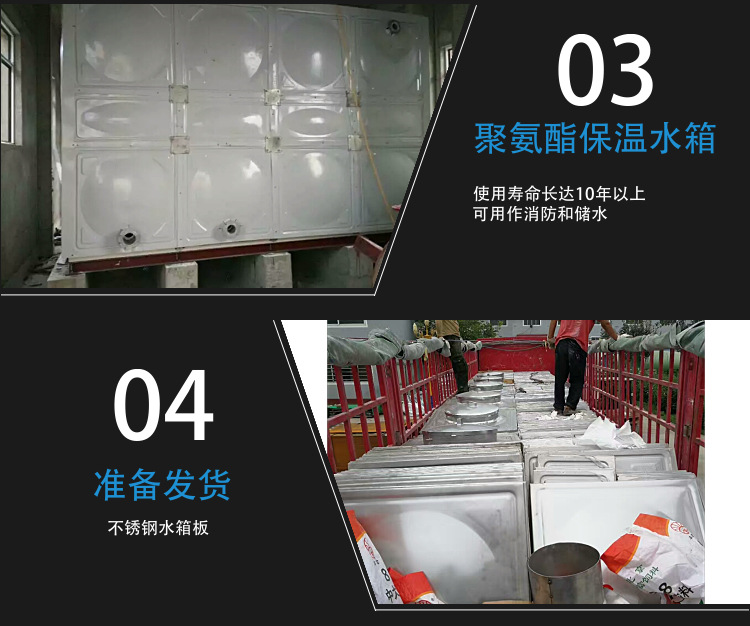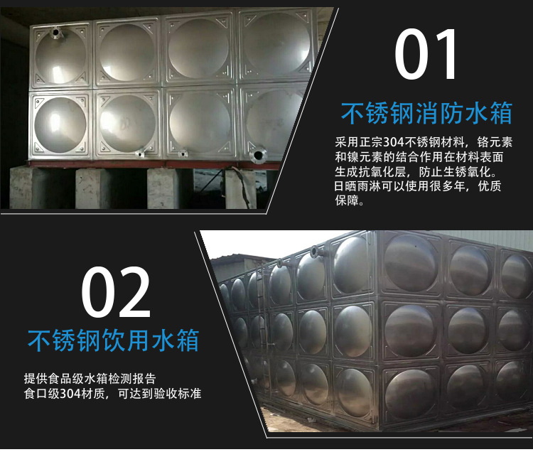 不銹鋼水箱選用食品級(jí)SUS304不銹鋼板材,徹底遮斷太陽(yáng)光照射,不滋生藻類,任何時(shí)候都保持水質(zhì)清潔,具有無(wú)滲透、重量輕、水質(zhì)好、外型美觀、使用壽命長(zhǎng)和安裝方便等優(yōu)點(diǎn)。