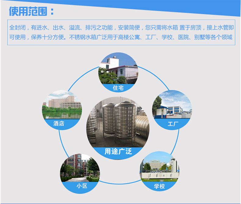 5、應用廣泛從1噸—5000噸規格不一均可制作,并可根據用戶提供的技術參數和要求制造加工,可廣泛用于建筑、消防、食品、化工、鍋爐保溫等多種行業。