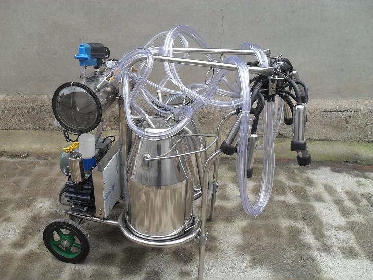 真空移動(dòng)式奶牛用擠奶機(jī)(擠奶器):噪音小、結(jié)構(gòu)簡單、操作靈活方便、工作平穩(wěn)、擠奶效率高、交替出奶。配有進(jìn)口脈動(dòng)器,擠奶柔和,不傷乳頭,有助于提高奶牛產(chǎn)奶量, 真空移動(dòng)式奶牛用擠奶機(jī)是根據(jù)國際標(biāo)準(zhǔn)技術(shù)要求設(shè)計(jì)的,具有性能穩(wěn)定,真空罐有效儲(chǔ)備大,噪聲低,操作簡單等優(yōu)點(diǎn)。擠奶機(jī)在水平狀態(tài)下工作,推到奶牛旁進(jìn)行擠奶,也可作真空氣源連接為管道式擠奶。本機(jī)采用旋片式真空泵,皮帶傳動(dòng),結(jié)構(gòu)緊湊合理,帶有自潤滑裝置,保證無故障運(yùn)行。采用不銹鋼真空罐,防止一時(shí)疏忽,大量的牛奶盛滿奶桶后或奶桶碰翻,牛奶通過橡膠管被抽入真空罐內(nèi),防止牛奶被抽入真空泵內(nèi)發(fā)生事故。 該系列擠奶機(jī)分為單桶式(HHYZ-I)和雙桶式(HHYZ-II),單桶式一次擠一頭牛,雙桶式可同時(shí)擠兩頭牛。每頭牛的擠奶時(shí)間為5-6分鐘(正常奶牛)。單桶式適合15頭以下的產(chǎn)奶牛群使用,雙桶式適合于20-30頭產(chǎn)奶牛群。超過30頭牛建議選用我司生產(chǎn)的提桶式擠奶機(jī)或者中置式、魚骨式擠奶廳。