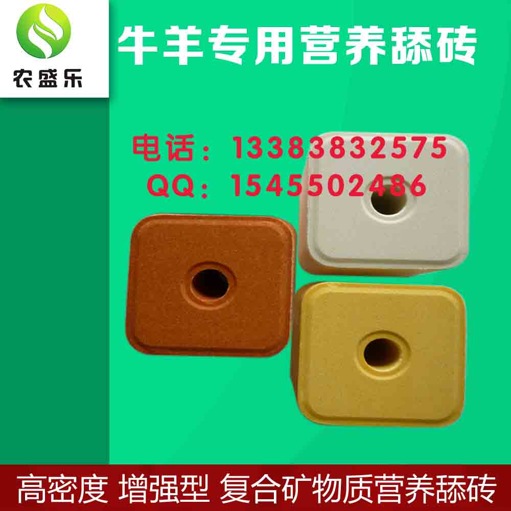 農盛樂舔磚是將牛羊所需的營養物質經科學配方加工成塊狀,供牛羊舔食的一種飼料,其形狀不一,有的呈圓柱形,有的呈長方形、方形不等。也稱塊狀復合添加劑,通常簡稱‘舔磚’或‘添磚’。理論與實踐表明:補飼舔磚能明顯改善牛羊健康狀況,加快生長速度,提高經濟效益。上世紀80年代以來,舔磚已廣泛應用于60多個國家和地區,,被農民親切地稱之為‘牛羊的巧克力’。
