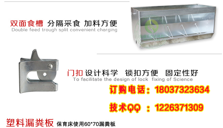 3、節(jié)省:保育床上安放雙面食槽處放實心型漏糞板,可防止飼料下漏,進一步節(jié)省飼料,降低養(yǎng)殖成本。
