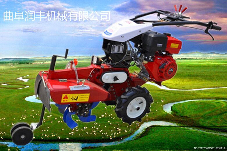 雙輪田園管理機,它包括機架、可調(diào)高低扶手,機架上設(shè)有(風冷或水冷)柴油機或汽油機、機架和扶手上設(shè)置有變速箱,變速箱的輸出軸上設(shè)置有能夠沿軸移動的驅(qū)動輪或鏈軌.傳動方式主要有:全齒輪傳動、皮帶傳動、鏈條傳動三種傳動方式.該機具有重量輕,油耗低、相對功率大,結(jié)構(gòu)緊湊、機動性強、操縱輕便靈活的特點。可爬坡、越埂、階梯性強。廣泛適用于平原、山區(qū)、丘陵的旱地、水田、果園、菜地、煙地的深旋耕、淺旋耕、犁耕。配上相應(yīng)機具可進行旱地旋耕、水田旋耕、抽水、開溝、噴淋、噴藥除草碎土等作業(yè),還可牽引拖車進行短途運輸,是大中型農(nóng)機無法媲美的多功能田園管理機,工作穩(wěn)定可靠、使用壽命長、維修方便等特點。是進入農(nóng)民家庭最理想的田園管理機。