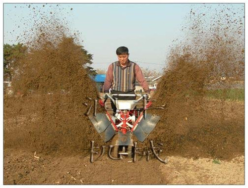 雙輪田園管理機,它包括機架、可調高低扶手,機架上設有(風冷或水冷)柴油機或汽油機、機架和扶手上設置有變速箱,變速箱的輸出軸上設置有能夠沿軸移動的驅動輪或鏈軌.傳動方式主要有:全齒輪傳動、皮帶傳動、鏈條傳動三種傳動方式.該機具有重量輕,油耗低、相對功率大,結構緊湊、機動性強、操縱輕便靈活的特點??膳榔?、越埂、階梯性強。廣泛適用于平原、山區、丘陵的旱地、水田、果園、菜地、煙地的深旋耕、淺旋耕、犁耕。配上相應機具可進行旱地旋耕、水田旋耕、抽水、開溝、噴淋、噴藥除草碎土等作業,還可牽引拖車進行短途運輸,是大中型農機無法媲美的多功能田園管理機,工作穩定可靠、使用壽命長、維修方便等特點。是進入農民家庭最理想的田園管理機。