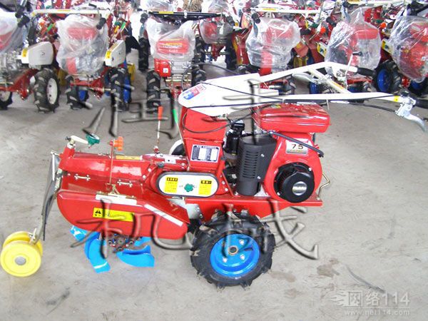 雙輪田園管理機,它包括機架、可調高低扶手,機架上設有(風冷或水冷)柴油機或汽油機、機架和扶手上設置有變速箱,變速箱的輸出軸上設置有能夠沿軸移動的驅動輪或鏈軌.傳動方式主要有:全齒輪傳動、皮帶傳動、鏈條傳動三種傳動方式.該機具有重量輕,油耗低、相對功率大,結構緊湊、機動性強、操縱輕便靈活的特點??膳榔?、越埂、階梯性強。廣泛適用于平原、山區、丘陵的旱地、水田、果園、菜地、煙地的深旋耕、淺旋耕、犁耕。配上相應機具可進行旱地旋耕、水田旋耕、抽水、開溝、噴淋、噴藥除草碎土等作業,還可牽引拖車進行短途運輸,是大中型農機無法媲美的多功能田園管理機,工作穩定可靠、使用壽命長、維修方便等特點。是進入農民家庭最理想的田園管理機。
