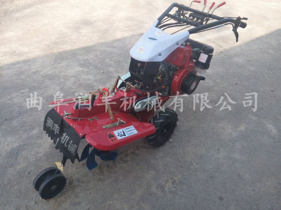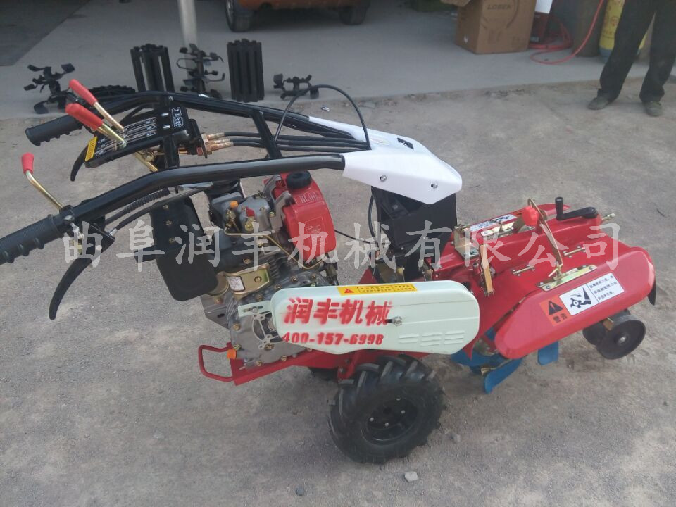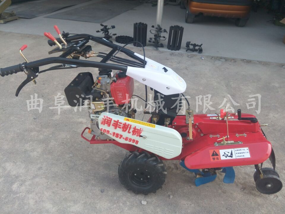 雙輪田園管理機,它包括機架、可調高低扶手,機架上設有(風冷或水冷)柴油機或汽油機、機架和扶手上設置有變速箱,變速箱的輸出軸上設置有能夠沿軸移動的驅動輪或鏈軌.傳動方式主要有:全齒輪傳動、皮帶傳動、鏈條傳動三種傳動方式.該機具有重量輕,油耗低、相對功率大,結構緊湊、機動性強、操縱輕便靈活的特點??膳榔?、越埂、階梯性強。廣泛適用于平原、山區、丘陵的旱地、水田、果園、菜地、煙地的深旋耕、淺旋耕、犁耕。配上相應機具可進行旱地旋耕、水田旋耕、抽水、開溝、噴淋、噴藥除草碎土等作業,還可牽引拖車進行短途運輸,是大中型農機無法媲美的多功能田園管理機,工作穩定可靠、使用壽命長、維修方便等特點。是進入農民家庭最理想的田園管理機。