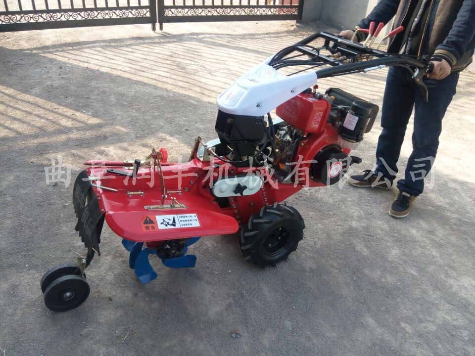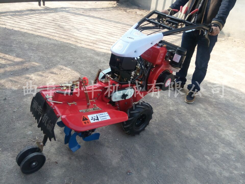 雙輪田園管理機,它包括機架、可調高低扶手,機架上設有(風冷或水冷)柴油機或汽油機、機架和扶手上設置有變速箱,變速箱的輸出軸上設置有能夠沿軸移動的驅動輪或鏈軌.傳動方式主要有:全齒輪傳動、皮帶傳動、鏈條傳動三種傳動方式.該機具有重量輕,油耗低、相對功率大,結構緊湊、機動性強、操縱輕便靈活的特點??膳榔?、越埂、階梯性強。廣泛適用于平原、山區、丘陵的旱地、水田、果園、菜地、煙地的深旋耕、淺旋耕、犁耕。配上相應機具可進行旱地旋耕、水田旋耕、抽水、開溝、噴淋、噴藥除草碎土等作業,還可牽引拖車進行短途運輸,是大中型農機無法媲美的多功能田園管理機,工作穩定可靠、使用壽命長、維修方便等特點。是進入農民家庭最理想的田園管理機。