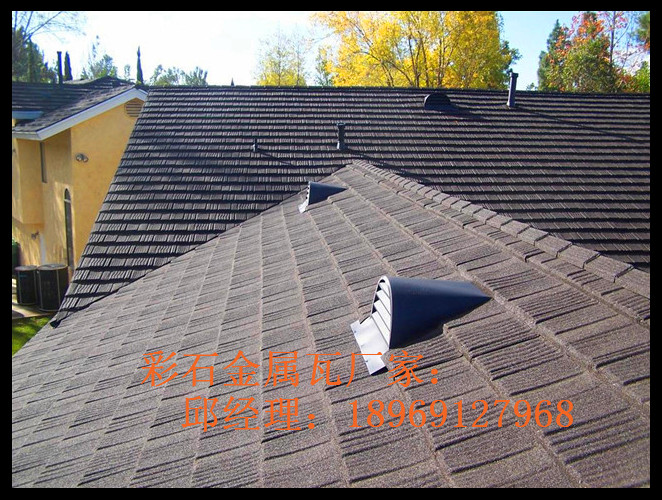 彩石金屬瓦本工程的屋面主材為彩石金屬瓦———彩石金屬瓦。該瓦以鍍鋁鋅鋼板為基材,其上下表面經(jīng)過保護膜處理,通過一體壓型生產(chǎn)出各種型式的瓦材,然后使用耐候高強丙烯酸樹脂把保護裝飾用的彩色砂粒粘合在鋼板表面,再噴涂外保護層制作而成。