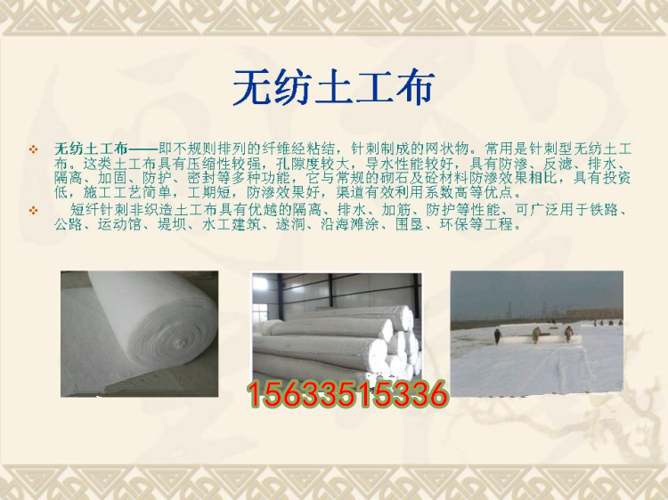 利用土工布良好的透氣性,使水流通過.從而有效的防止砂土流失。土工布具有良好的導水性能,它可使土體內部形成排水通道,將土體結構內多余液體和氣體外排。利用土工布增強土體的抗拉強度和抗變形能力,增強建筑結構的穩定性,以改善土體質量。有效的將集中應力擴散、傳遞或分解,防止土體受外力作用而破壞。防止上下層砂石、土體及混凝土之間混雜。網孔不易堵塞因不定型纖維組織形成的網狀結構有應變性和運動性。高透水性在土水的壓力下,仍能保持良好的透水性。耐腐蝕、耐酸堿、不蟲蛀、抗氧化。施工簡單,效率高。