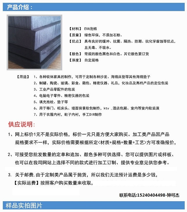 EVA材料質(zhì)量:每年我們廠都會(huì)拿材料去做SGS環(huán)保和出口檢測,材料質(zhì)量請(qǐng)放心,如需檢測報(bào)告,請(qǐng)聯(lián)系;15240404498