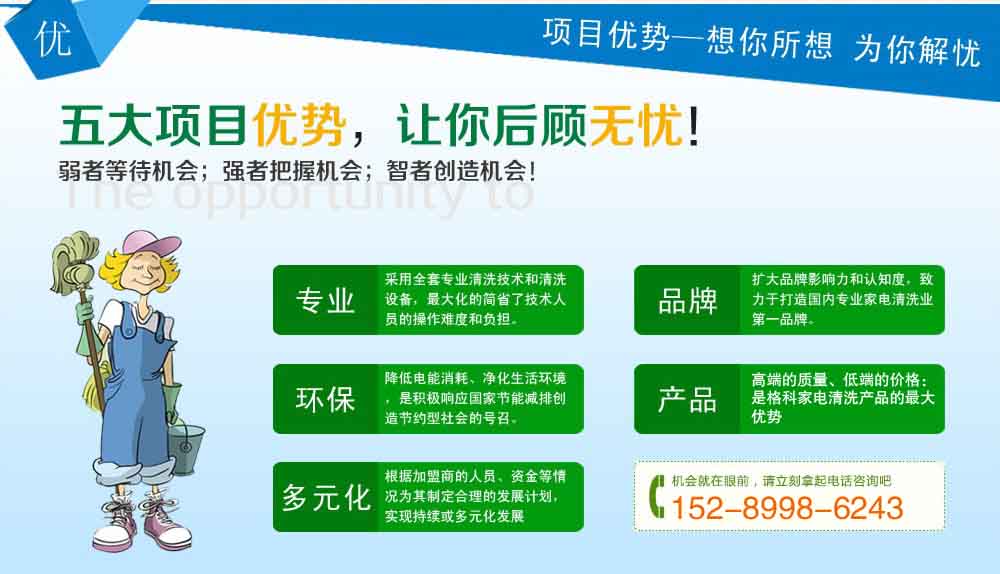 格科憑借多年的服務經驗,目前在國內家電清洗是一個新興行業,剛剛起步,是一個利潤、前景巨大的行業。格科以為客戶打造綠色健康、環保低能的家電使用環境,希望更多有志于創造自己一番事業,想在業余時間開展第二副業的朋友一起加入到這個綠色環保的行業中來。近幾年來格科開展全國招商加盟,在廣西玉林、云南、山東、貴港、平果、湖南、上海等全國各地擁有上千家加盟商。