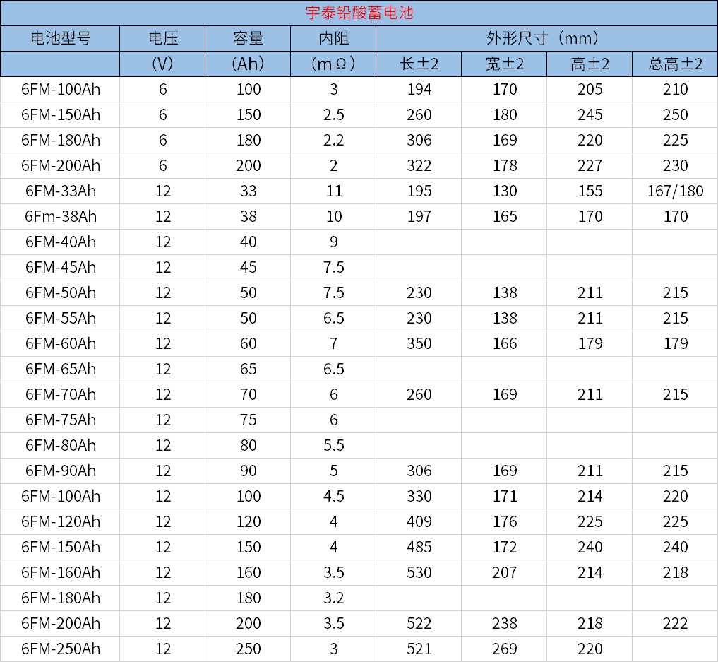 宇泰蓄電池在國內廣東、江蘇、安徽和國外馬來西亞、斯里蘭卡、印度建有8個區域性生產基地,占地面積100多萬平方米,共有員工近10000余人,其中技術研發人員400余人。宇泰擁有的76條電池生產線及相應的檢測設備,以及廣東、江蘇兩個專門的蓄電池研發中心,共同構成了企業先進而雄厚的研發制造能力,企業生產的備用型、起動型、動力型全系列鉛酸蓄電池包括:AGM閥控式密封鉛酸蓄電池,膠體(GEL)閥控式密封鉛酸蓄電池,純鉛電池,UPS用高功率系列電池,船舶用電池,鐵路用電池,起停電池,汽車用鉛酸蓄電池,摩托車用鉛酸蓄電池,OPzV、OPzS、PzS、PzV、PzB管式極板鉛酸蓄電池,高爾夫球車用鉛酸蓄電池,掃地車電池,電動助力車用鉛酸蓄電池等系列產品。產品廣泛應用于通信、電力、廣電、鐵路、太陽能、UPS、應急燈、安防、報警、園藝工具、汽車、摩托車、高爾夫球車、叉車、電動車、童車等十幾個相關產業,年生產能力總和超過2000萬千伏安時。
