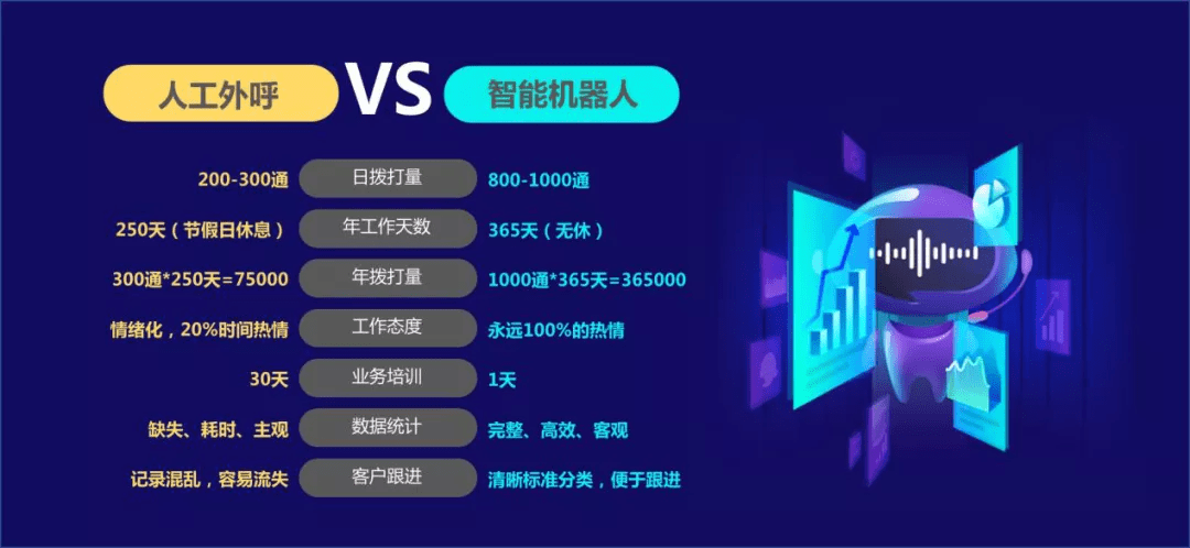 4、機器人跟人工員相比,性價比是非常高的,一個員工底薪就可以買到一個年制版,每天外呼三千的機器人。