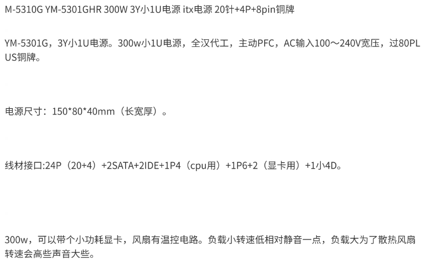 3Y POWER YM-5310G YM-5301GHR 300W電源供應器 小1U電源itx電源20P+4P+8pin