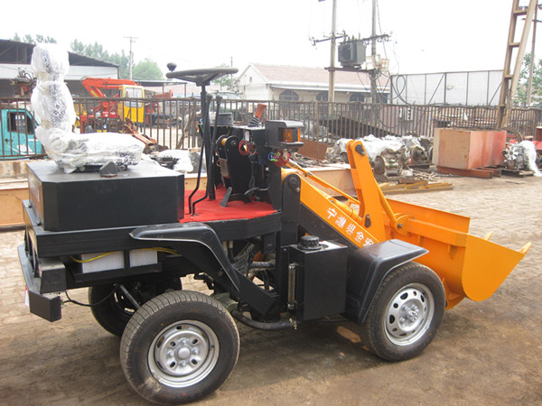 電動小鏟車,包括小鏟車車體,它有支架、支架的上部通過支桿安裝有上軸承套和下軸承套,上、下軸承套內分別安裝有軸承和另一軸承,兩軸承內側安裝有套筒,套筒的上端固定有托架,下部安裝在滑輪組上的纜繩的上端纏繞在轉輪上,轉輪安裝在托架后部的轉軸上,轉軸上還安裝有另一轉輪,另一轉輪上纏繞的繩的另一端纏繞在托架中部的另一轉軸上,固定在另一轉軸上的第三輪上纏繞的鋼絲繩的另一端連接在裝載機車體上的立桿的上部,套筒的外面有絕緣筒,三相交流點的三根電源線分別連接在互相之間絕緣的三個金屬片上,各金屬片安裝在彈性板上,且與絕緣筒的外面套裝的三個金屬環貼合在一起,另外三根電源線的一端分別穿過套筒連接在三個金屬環上、中部通過多個滾輪吊裝在鋼絲繩上、另一端分別連接在立桿的另外的三個金屬片上,這三個金屬片安裝在另一彈性板上,且與立桿上端的三個金屬環貼合在一起,立桿內的電源線一端分別穿過立桿與三個金屬環連接在一起,另一端連接在裝載機體內的直流電動機上,直流電動機的軸與主軸箱的輸入軸連接在一起,滑輪組的下面有配重塊。