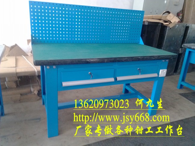 1、 組裝型的鉗工臺工作桌類,桌腳和桌架及桌面之間為螺絲鏈接組成。
